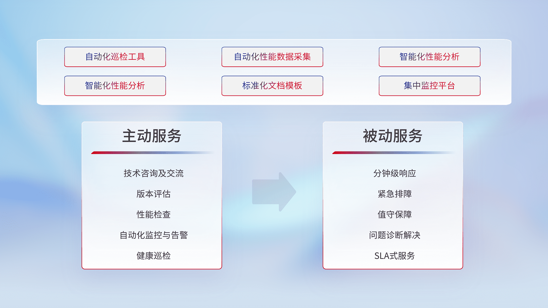 智能化工具和标准化文档,,,保障服务质量,,提供主动服务(包含技术咨询、、、、版本评估、、、、性能检查、、、自动化监控与告警、、、健康巡检)和被动服务包含(分钟级响应、、、、紧急排障、、、值守保障、、、问题诊断解决、、、SLA服务)。。。。